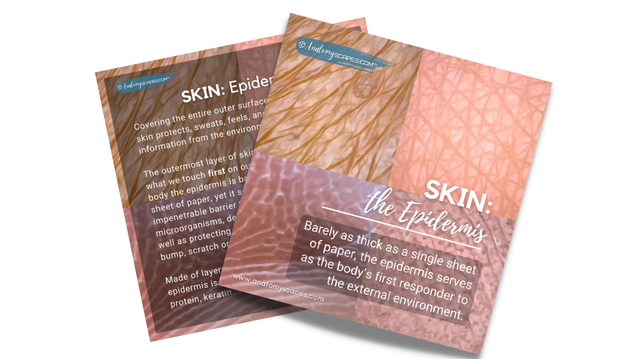 Join us as we journey to the surface to explore the skin's epidermis â that thin, almost impenetrable outer layer that protects everything beneath it. We'll discover its constantly renewing layers of keratin-filled cells, explore how it creates our skin color, examine its remarkable texture variations across the body, and understand its role as both barrier and sensory interface â with all the color and clarity that you've come to expect from AnatomySCAPES.