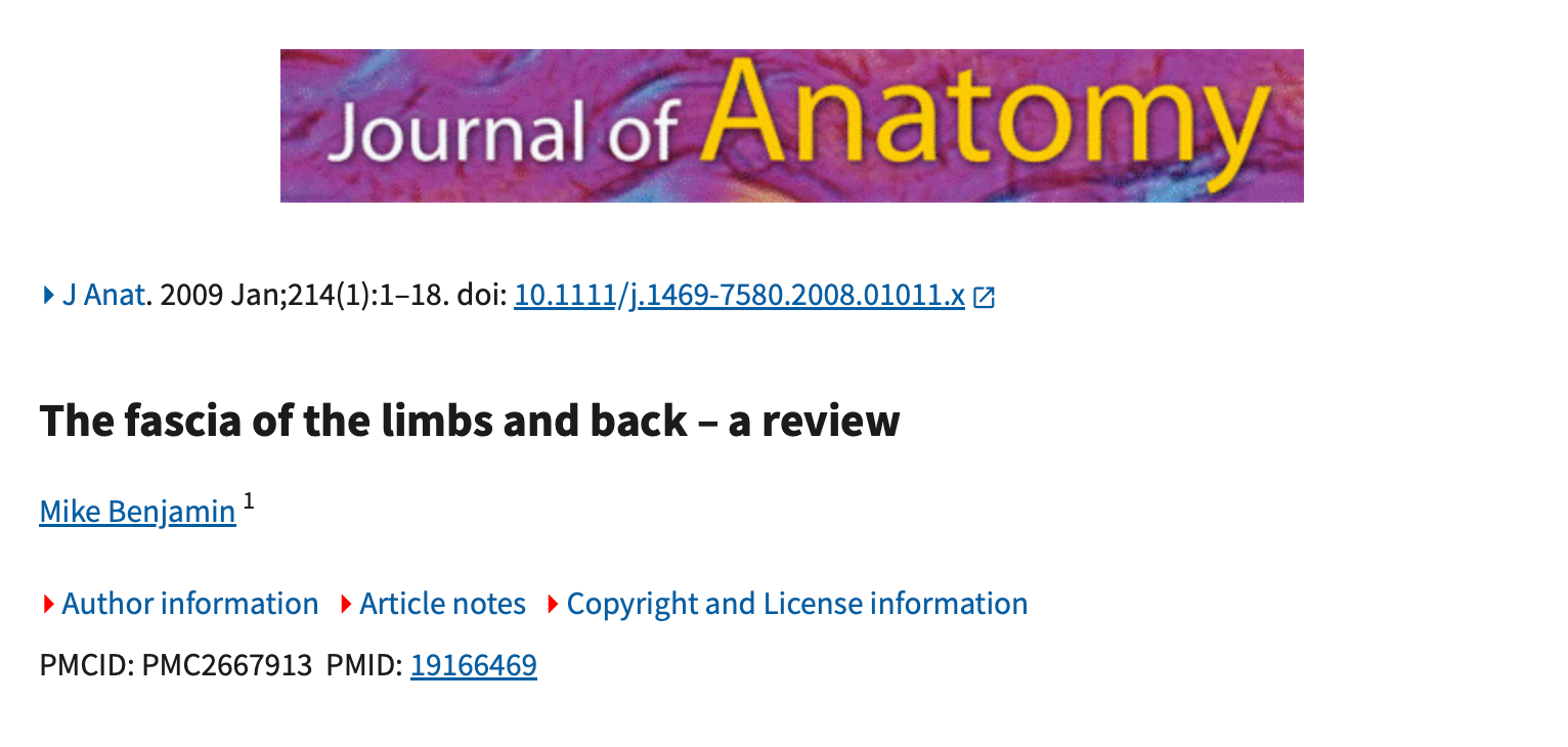 Mike Benjamin's 2009 review "The fascia of the limbs and back" is one of the most cited articles detailing the literature on the anatomy of fascia — from skin to deep, and from head to toe. The other articles are a sampling of work from Carla Stecco's research team at the University of Padua (Italy) as they continue with their aim to document the fascial system through combined means of 1) dissection, 2) histology, and 3) ultrasound.