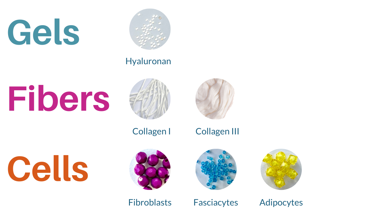 ALL fascia is made of gels, fibers, and cells. These three ingredients in different proportions and arrangements determine the tissue’s physical and physiological properties, including the texture we feel under our hands. It can be super strong and supportive OR more of a slippery-slidey, shape-shifting goo.